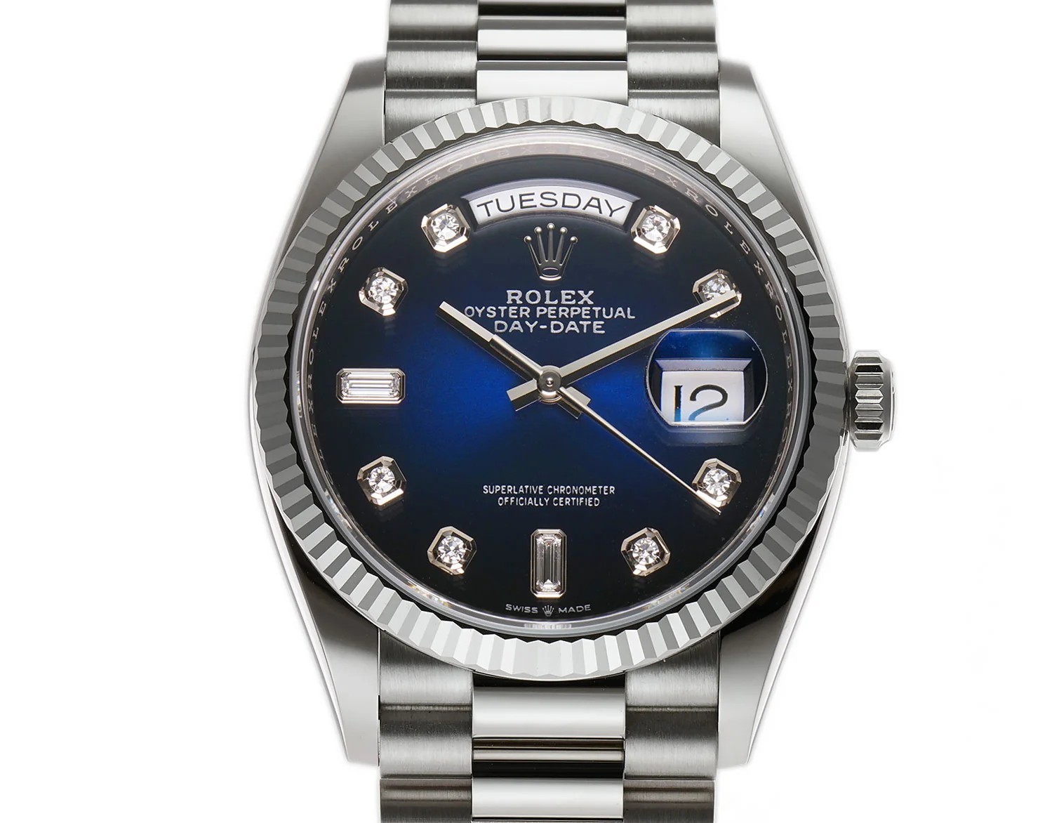36mm 18k White Gold President Blue Ombré Baguette Diamond Dial