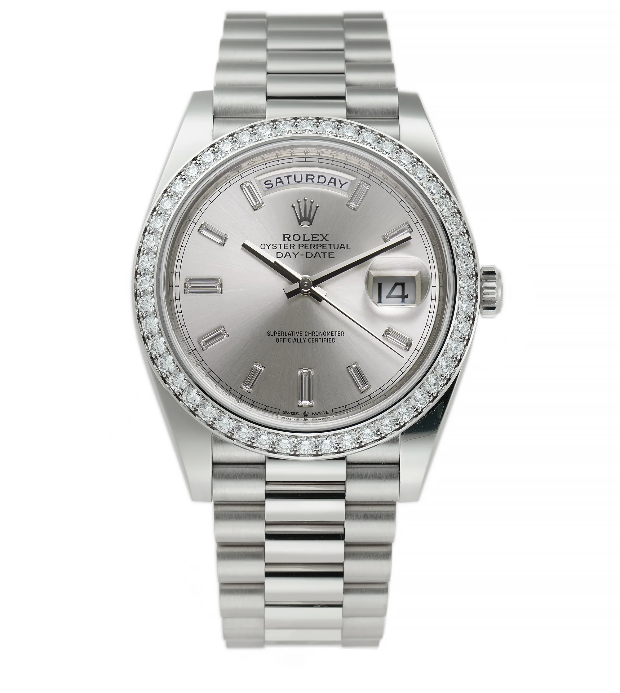 40mm President 18k White Gold Diamond Bezel Silver Baguette Diamond Dial
