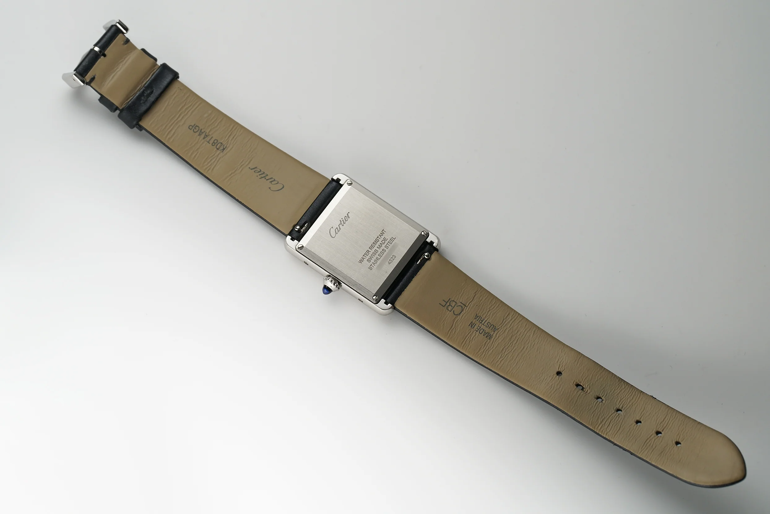 This case is made of stainless steel, displaying a combination of mirror and satin finishes. On the case you have Cartier factory set diamonds. The watch is paired with a black leather Cartier strap (approximately 80% condition) and that is equipped with a stainless steel Cartier tank buckle.