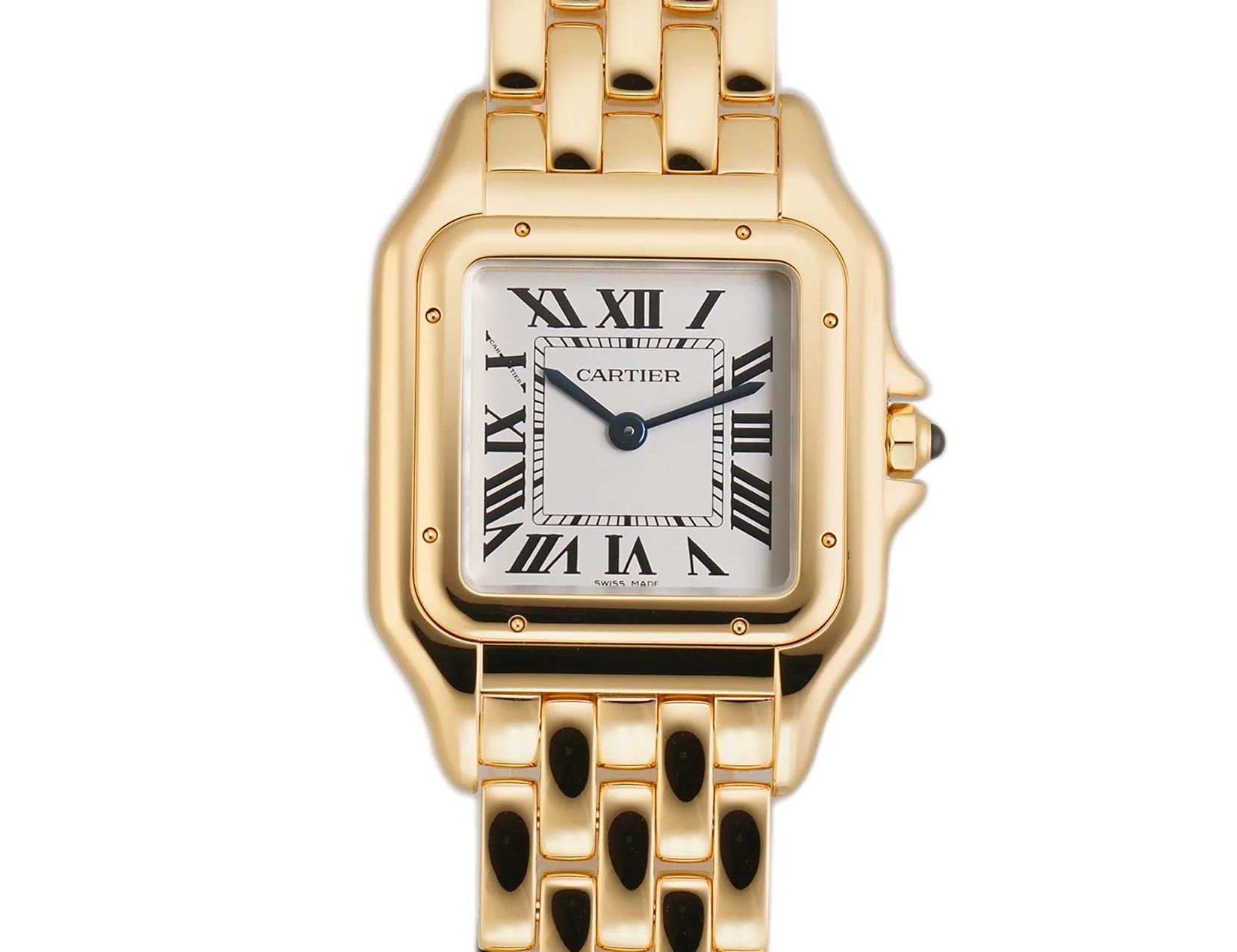Case us made of a mirror-finished 18k yellow gold including the crown with the spinel. Mounted atop the case is a mirror-finished 18k yellow gold fixed bezel. The watch is paired with an 18k yellow gold bracelet, also displaying a mirror finish.