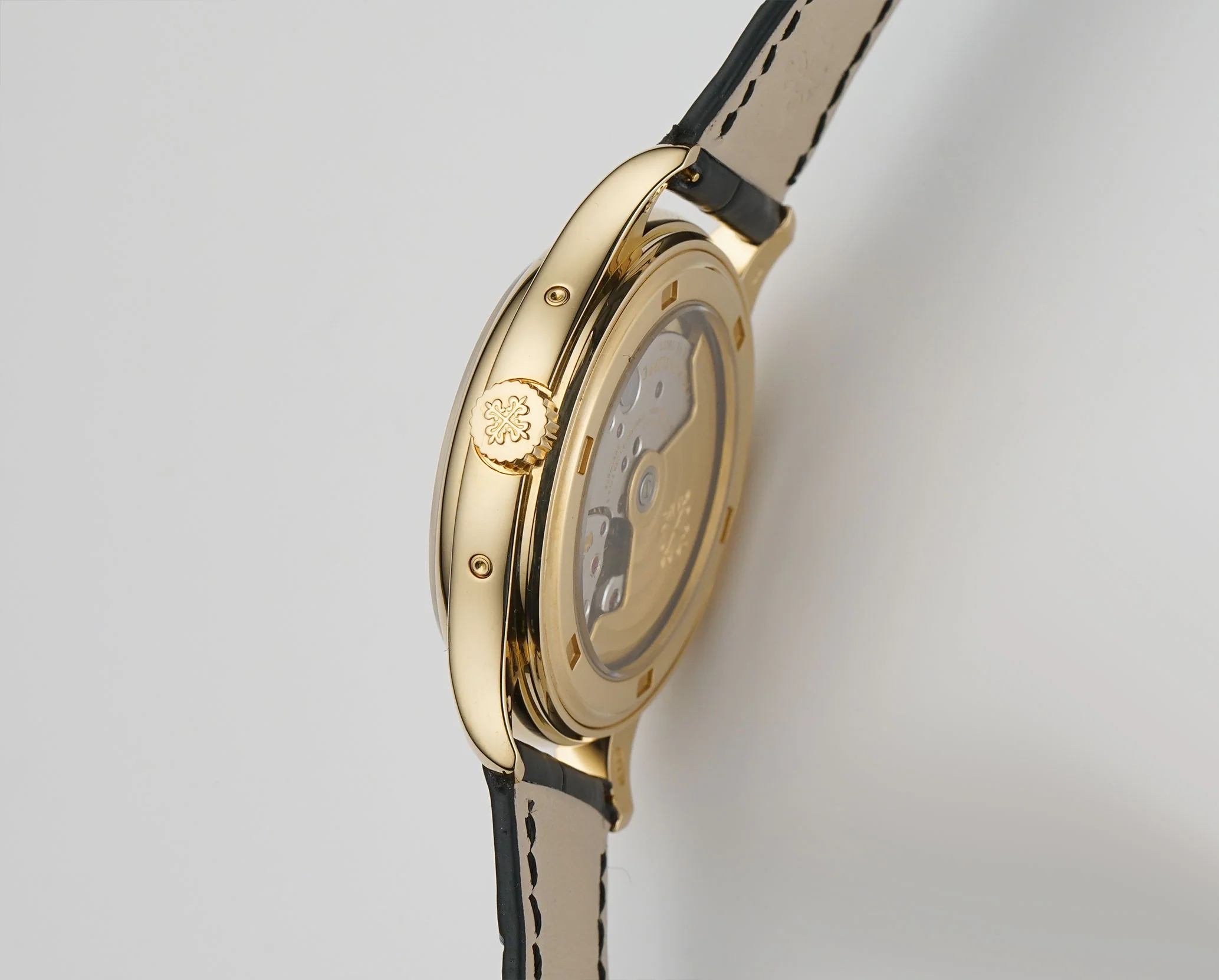 The case is made of a mirror-finished 18k yellow gold as is the fixed bezel mounted atop. It is paired with an unworn Patek Philippe black leather strap that is equipped with a Patek Philippe 18k yellow gold deployment buckle.