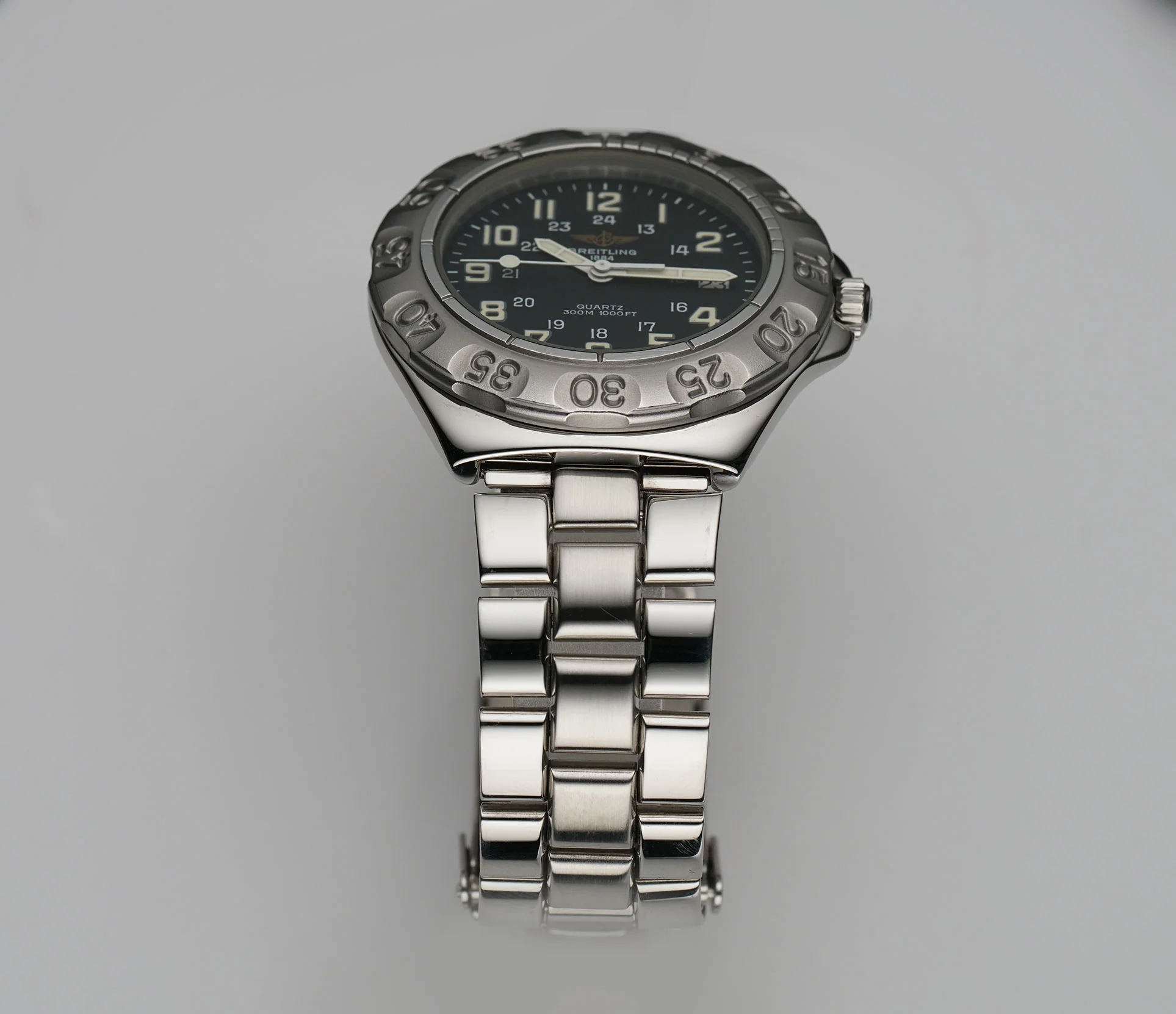 The case is made of a mirror-finished stainless steel while the 60-mimute scaled rotatable bezel is of a satin-finished stainless steel. As for the Breitling bracelet, it is a combination of mirror and satin finished stainless steel (fits up to an approximate 7 inch wrist).