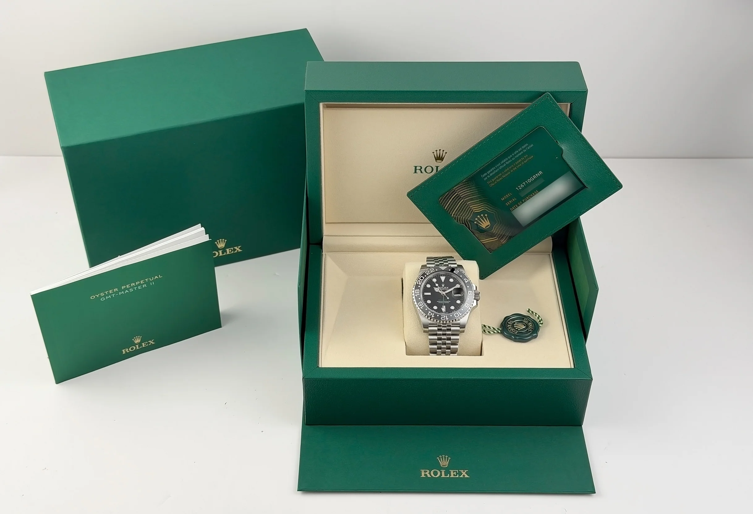 This Rolex GMT-Master II 126710GRNR-0003 is unworn with original box and papers.
