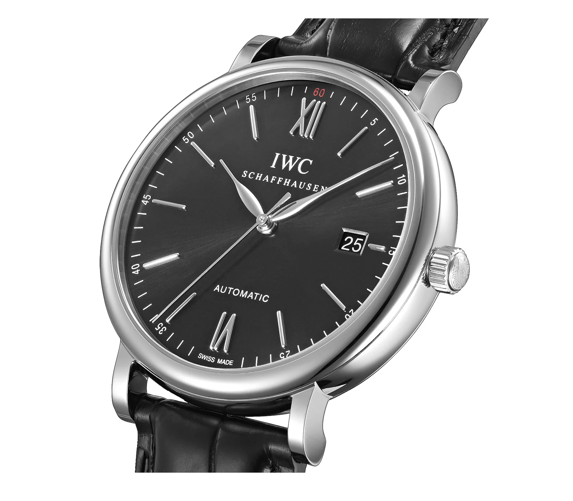 Time and date are displayed on a black dial that is accompanied by hands and hour markers. Featured on the dial is a date aperture at 3 o'clock.