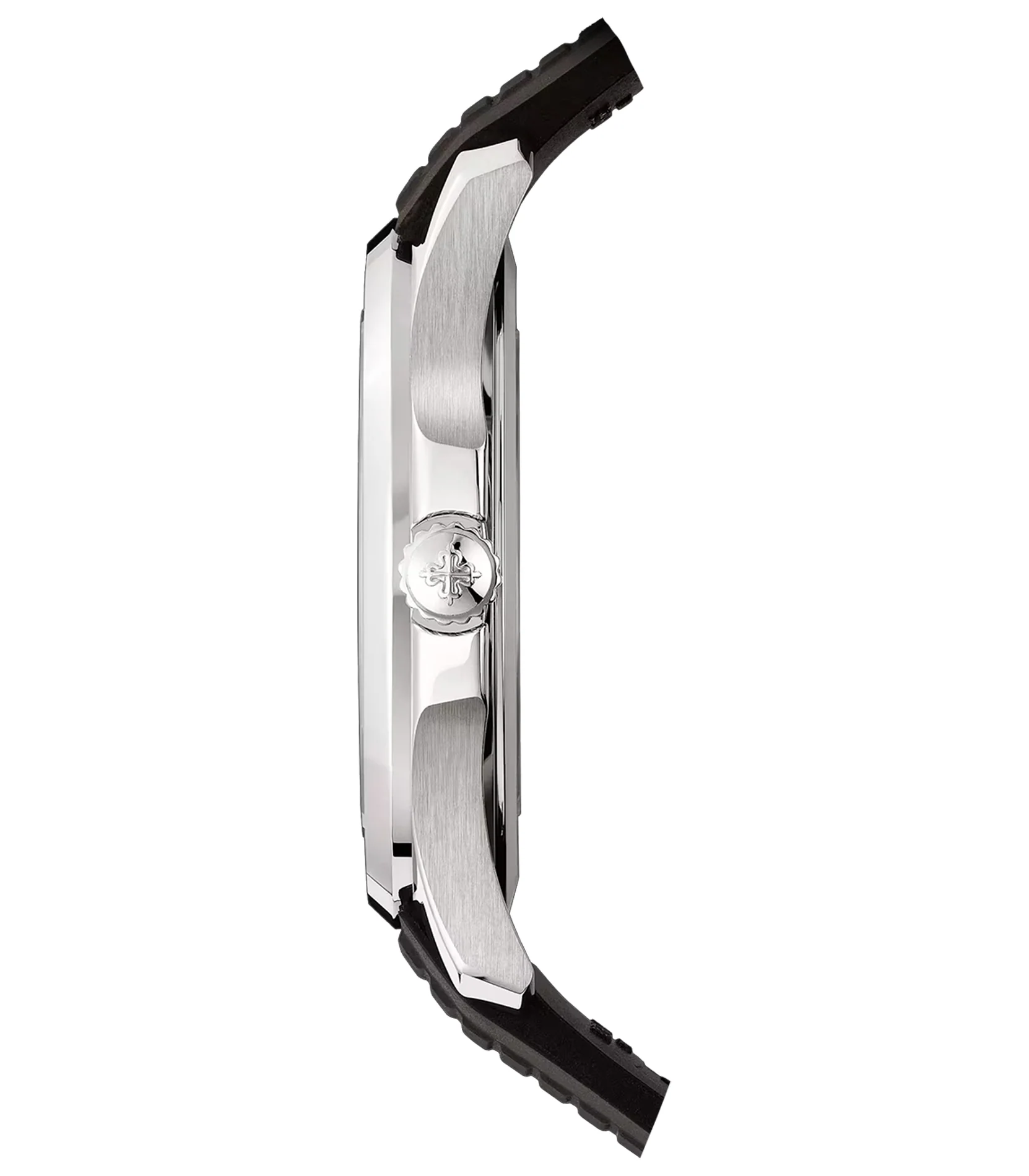 Time and date are displayed on a sunburst charcoal gray with black-gradient rim, embossed aquanaut pattern dial that is accompanied by luminescent filled hands as well as luminescent filled Arabic numerals and luminescent applied markers on the outskirts.