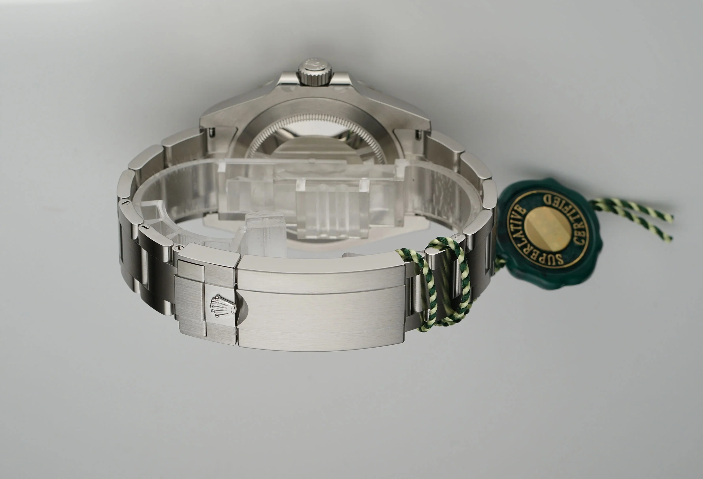 The case is made of stainless steel with satin-finished lugs and mirror-finished sides. Mounted atop the case is a unidirectional rotatable stainless steel bezel which is equipped with a Green ceramic diver's bezel insert. Screwed into the case is a solid case back and crown, both stainless steel steel. The oyster bracelet is stainless steel as well, mostly satin-finished with the exception of the sides of the links which are miror-finished.Â