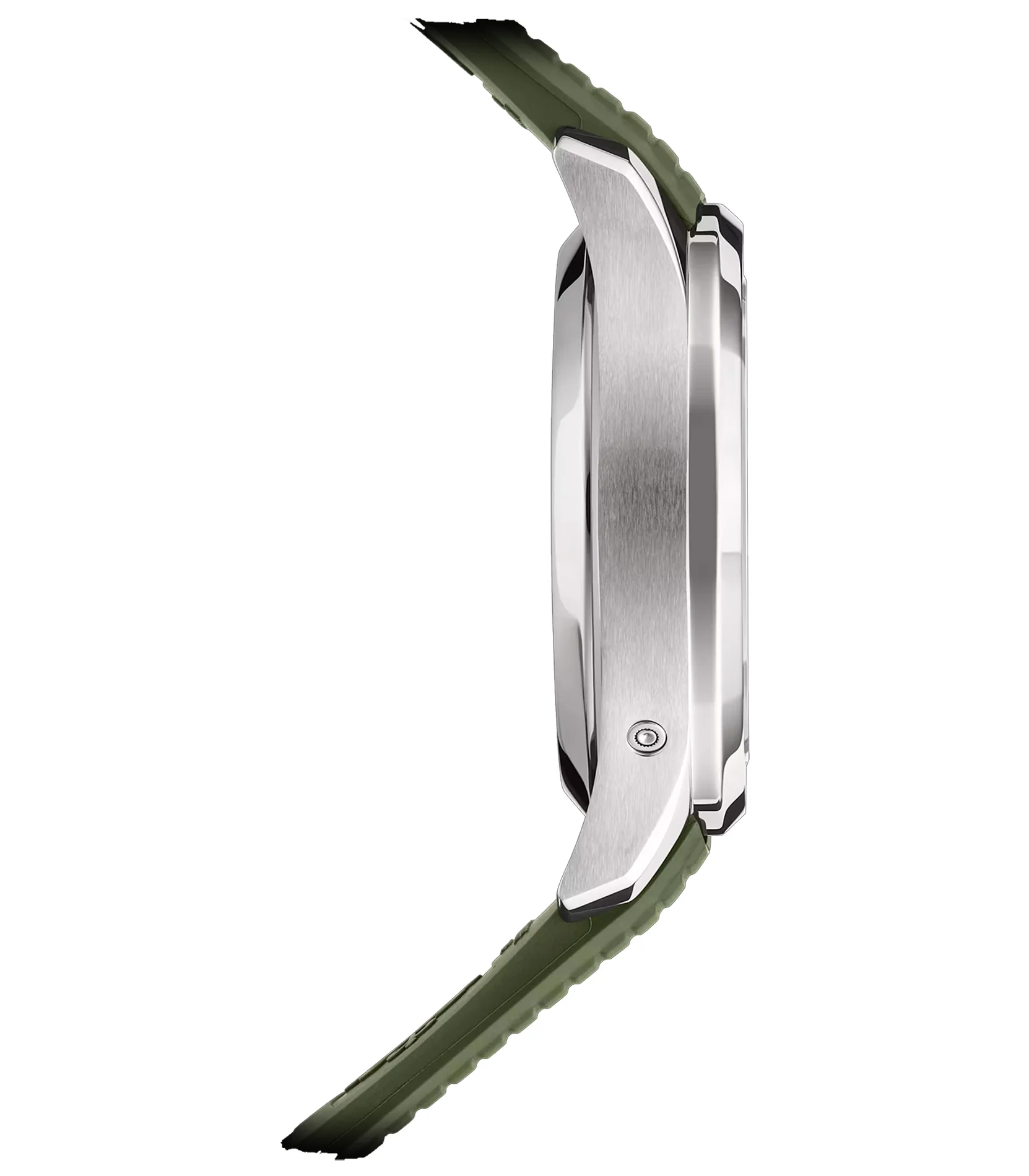 Case is made of 18k white gold with a combination of both mirror and satin finishes. The bezel mounted atop is of 18k white gold with a satin finished base and mirror finish edge. As for the strap, it is a Khaki Green composite tropical (composite because they added certain elements to rubber in order to enhance the durability) rubber strap that features a design which compliments the dial.