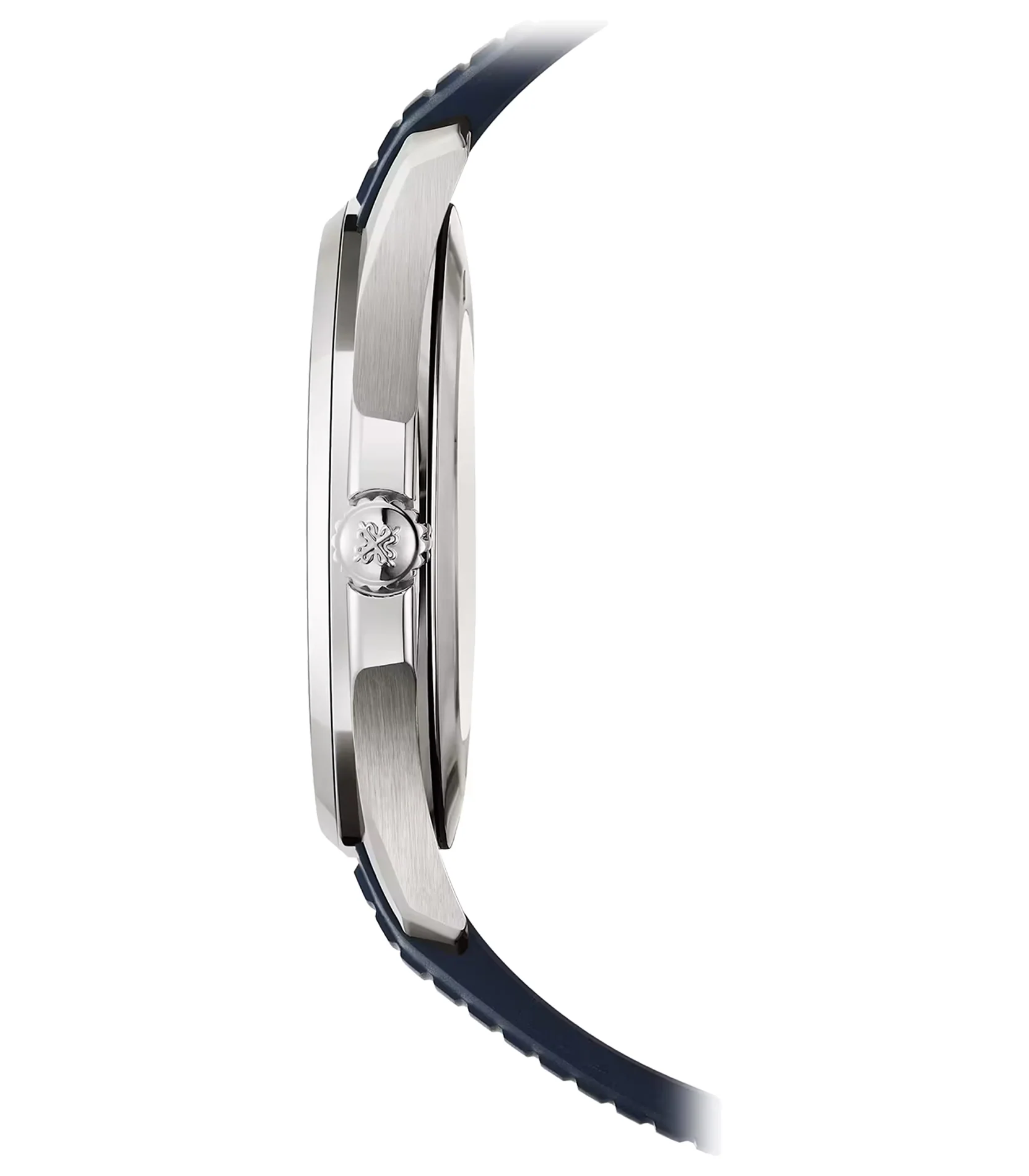 Case is made of 18k white gold with a combination of both mirror and satin finishes. The bezel mounted atop is of 18k white gold with a satin finished base and a mirror finished edge. As for the strap, it is a midnight blue composite tropical (composite because they added certain elements to rubber in order to enhance the durability) rubber strap that features a design which compliments the dial.