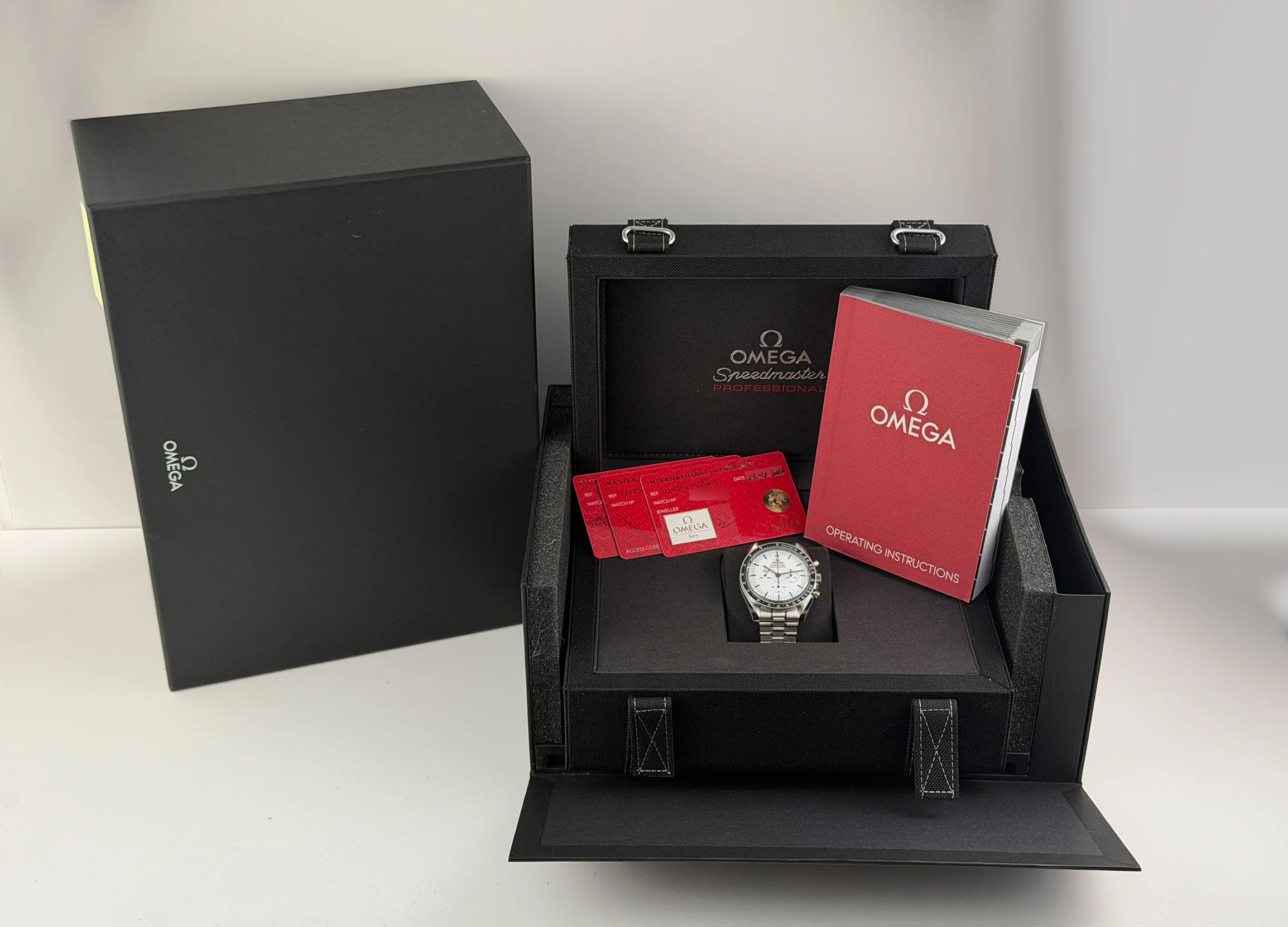 This Speedy Moonwatch O31030425004001 is in excellent condition for a previously owned watch, worn once. The case does have areas of mirror-like finish which are prone to hairlines (marks visible when with high resolution cameras or if angled at certain lighting). Pictures are part of the description so please refer to the pictures in determining the condition, pictures are of the exact watch being offered.