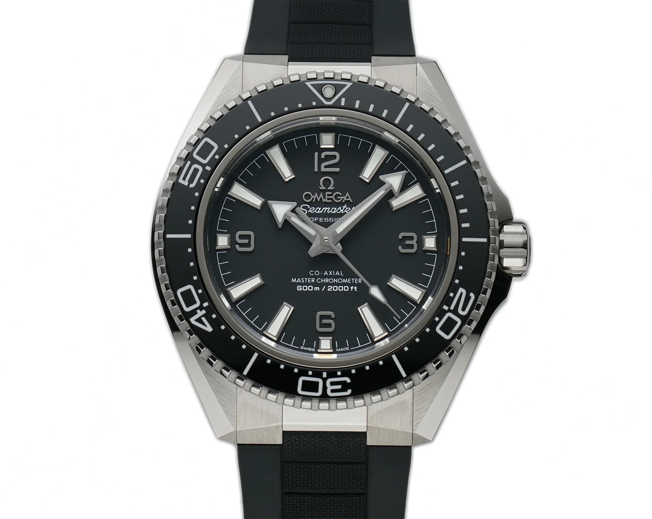 The case is made with combination of satin and mirror finished stainless steel. Mounted atop the case is a unidirectional bezel equipped with a black ceramic diver's bezel insert. The case back of the watch is made from mirror and satin finished grade 5 titanium and displays OMEGA’s famous seahorse emblem. The watch is paired with a black rubber strap with a stainless steel deployment clasp.