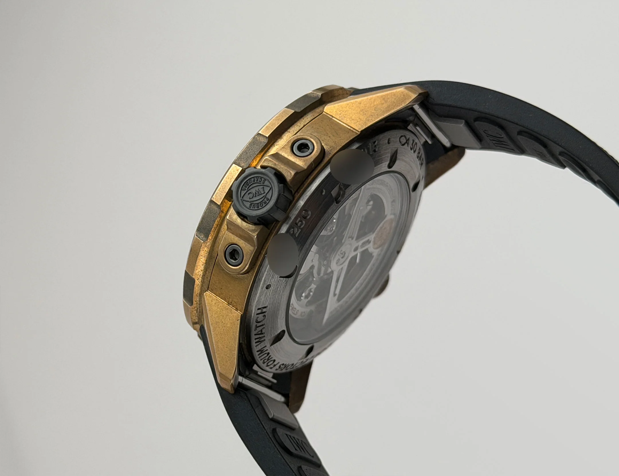 The case is made of bronze as is the bezel mounted atop. As for the case back, it is an exhibition display with a stainless steel outer rim. It is currently mounted on an IWC black rubber strap (approximately 85% condition) and that is paired with an IWC bronze tang buckle.
