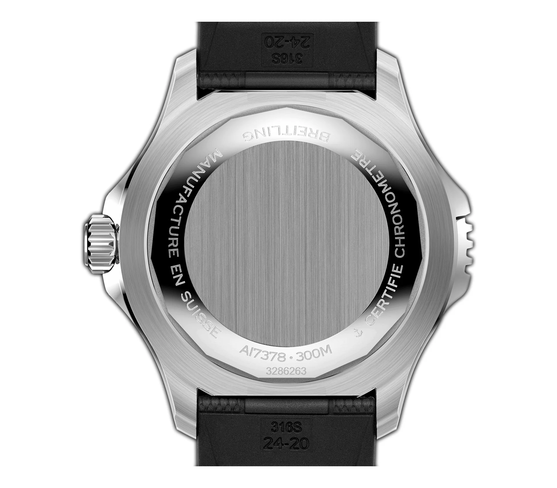 Case is made of stainless steel, most of which is brush-finished with the exception of some highlights that are of high-polished finish. Mounted atop the case is a stainless steel bezel equipped with a black ceramic diver's bezel insert. The watch is presented on a black rubber strap with a deployment buckle.