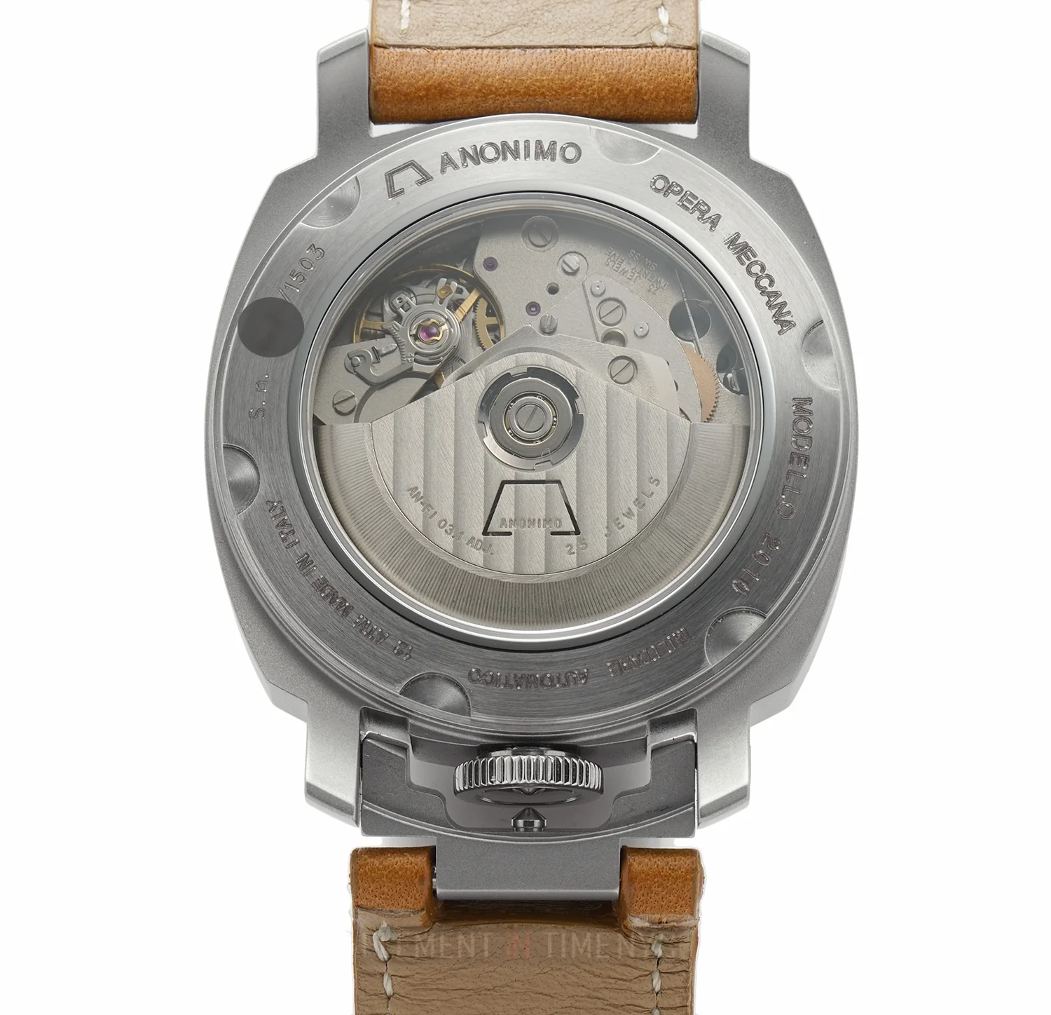 Currently Mounted On The Watch Is An Anonimo Brown Leather Strap. Securing The Watch On The Wrist Is An Anonimo Stainless Steel Tang Buckle.