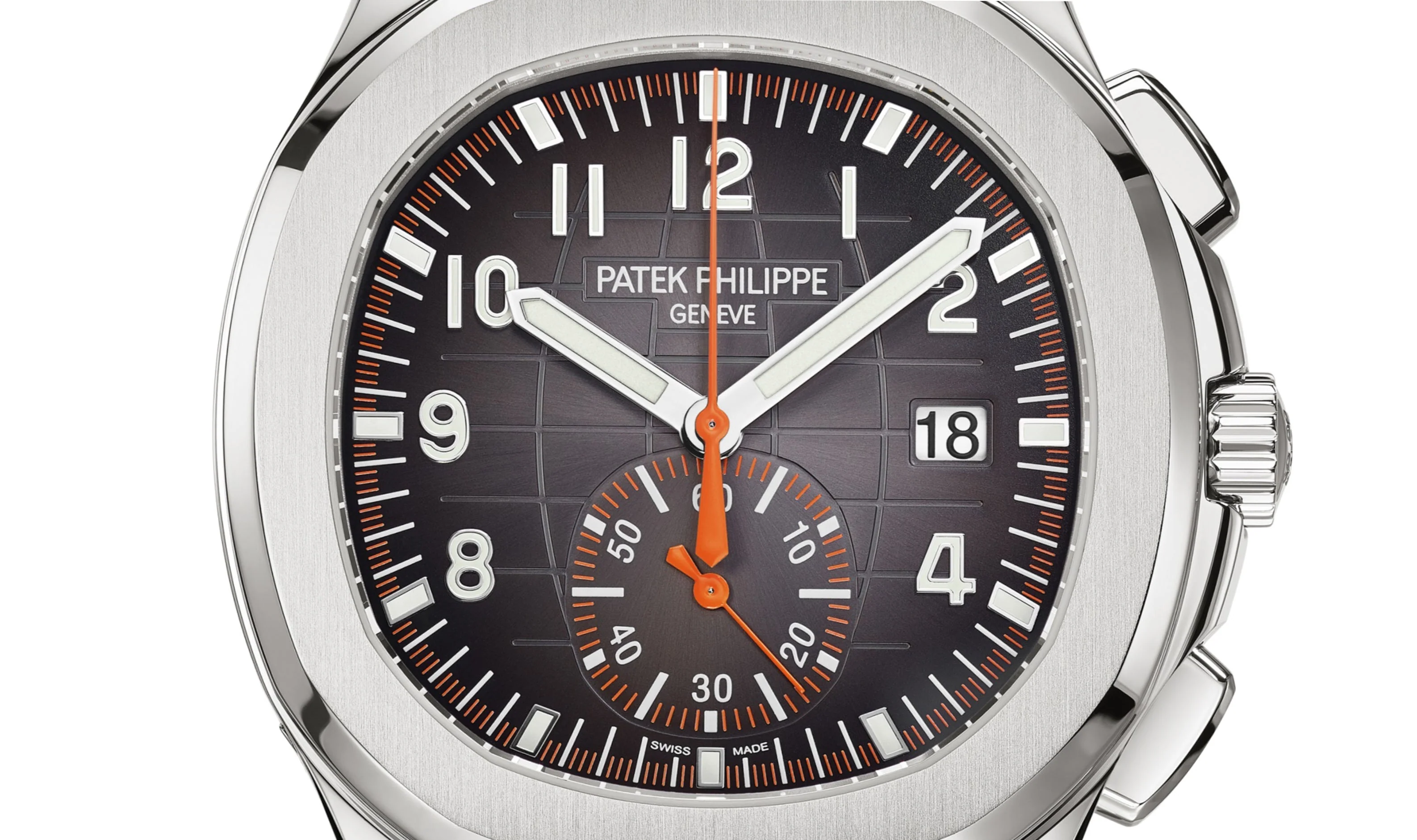 Functions are displayed on Sunburst charcoal gray with black-gradient rim, embossed aquanaut pattern dial with luminous hands and hour markers. These functions include hours, minutes, chronograph and minutes register.