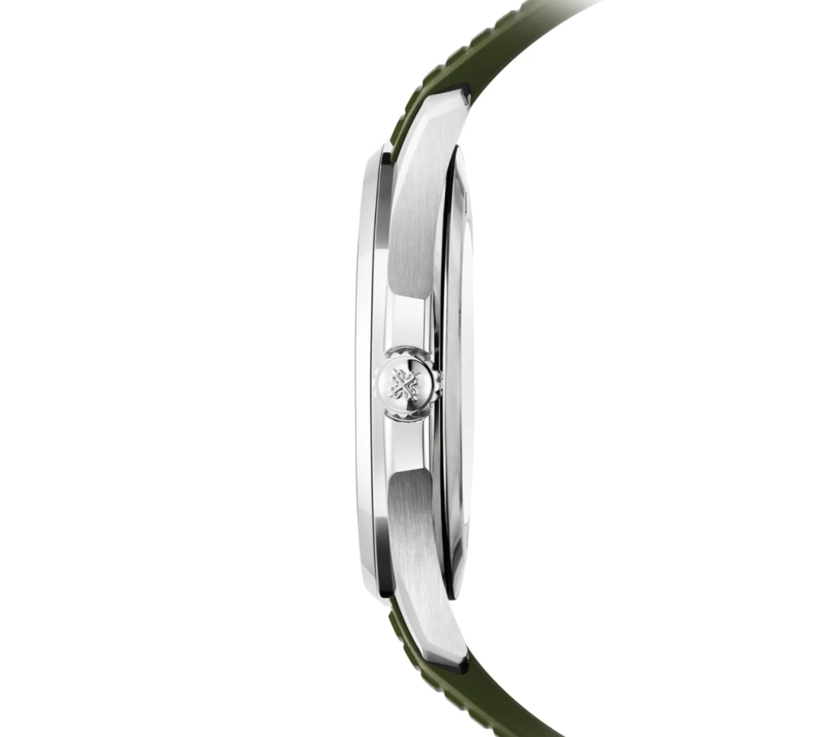 Case is made of 18k white gold with a combination of both mirror and satin finishes. The bezel mounted atop is of 18k white gold with a satin finished base and a mirror finish edge. As for the strap, it is a khaki green composite tropical (composite because they added certain elements to rubber in order to enhance the durability) rubber strap that features a design which compliments the dial.