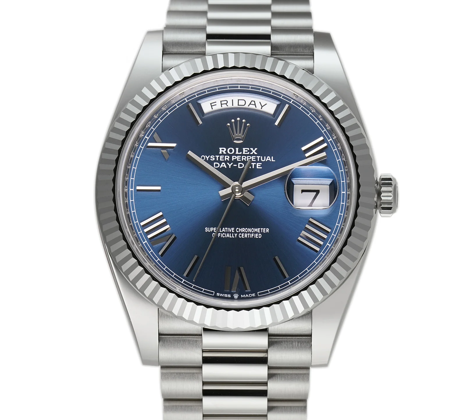 Case is made of high-polish finished 18k white gold as is the fluted bezel that is mounted atop. Screwed into the case is a solid 18k white gold crown and a solid 18k white gold case back. The presidential bracelet is of the same material, with high-polish finished center links and brush-finished outer links.Â