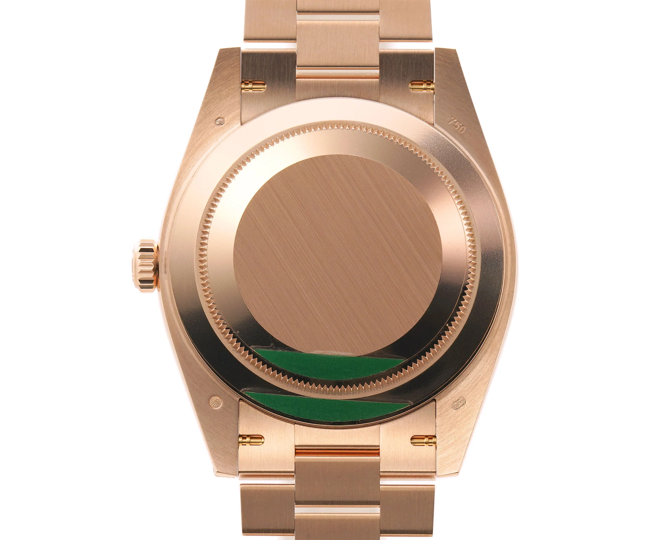 Case is made of high-polish finished 18k everose gold and mounted atop the case is a high-polish finished 18k everose gold fluted bezel. Screwed in to the case is an 18k everose gold gold crown as well as an 18k everose gold solid case back.
