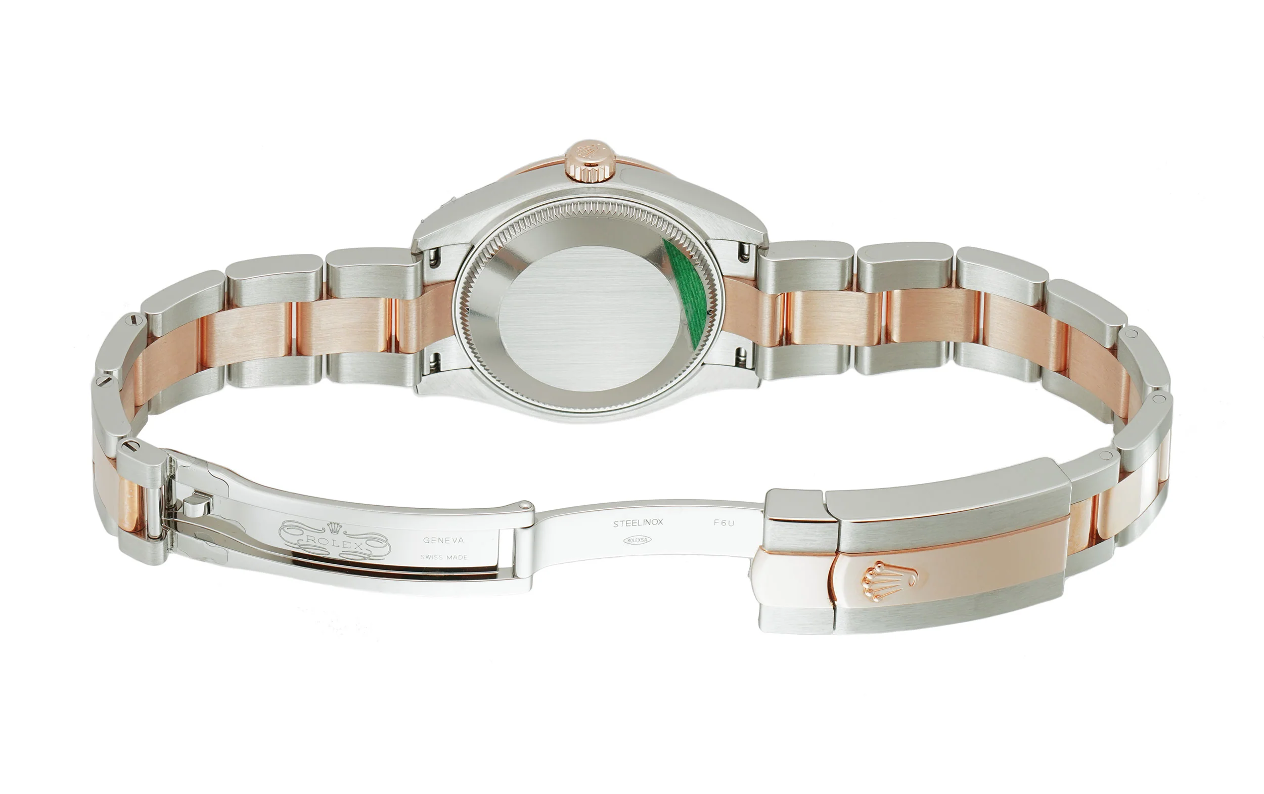 Case is made of high-polish finished stainless steel with a high-polish finished 18k everose gold fluted bezel mounted atop. Screwed down into the case is a solid stainless steel case back as well as an 18k everose gold crown. The oyster bracelet consists of brush-finished stainless steel outer links and high-polish finished 18k everose gold center links.Â