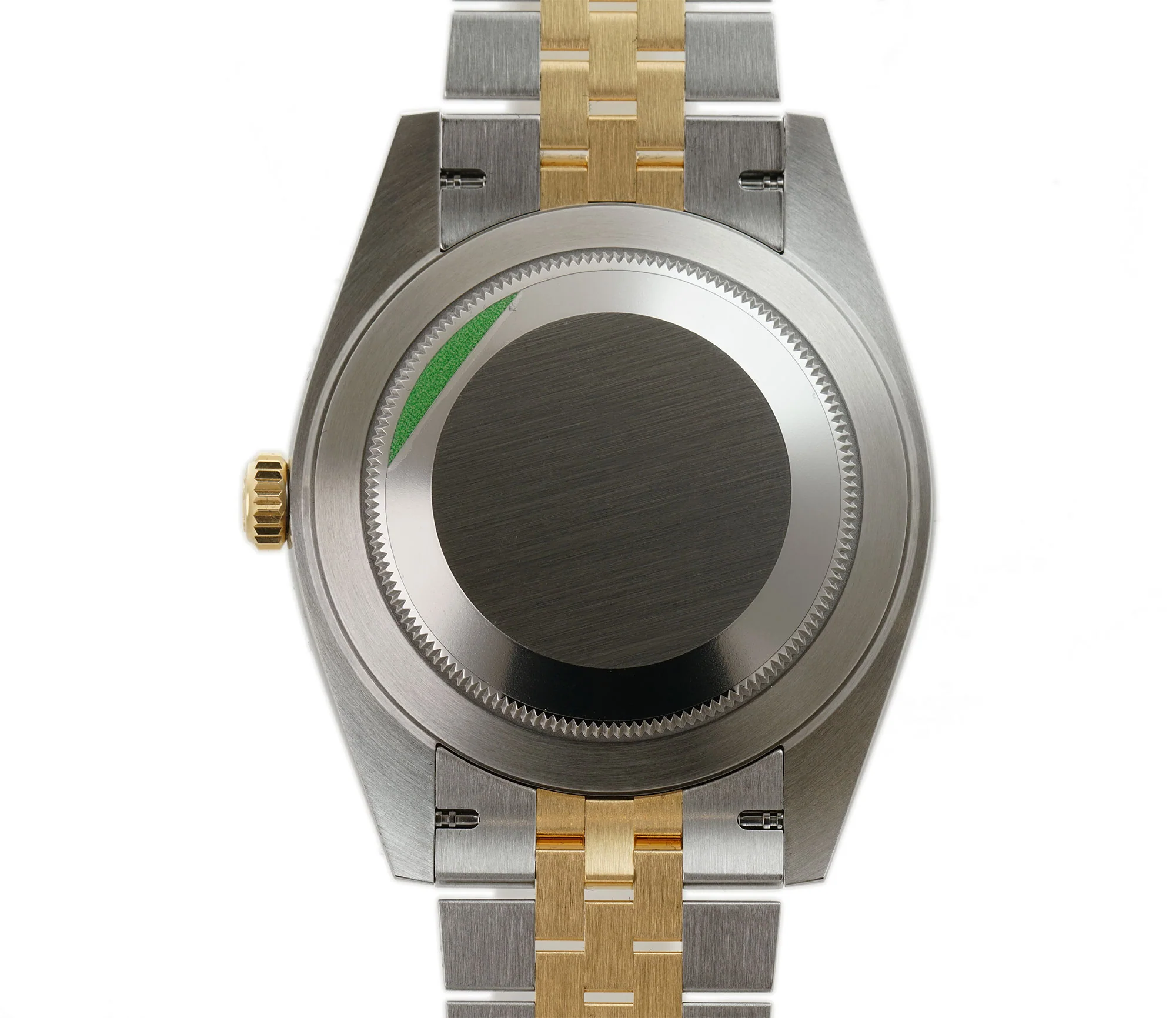 Case is made of high-polish finished stainless steel with the exception of the case back which is combination of satin-finished and high-polish stainless steel. Mounted atop is a fluted 18k yellow gold bezel. The jubilee bracelet is of 18k yellow gold high-polish finished center links and stainless steel satin-finished outer links.Â