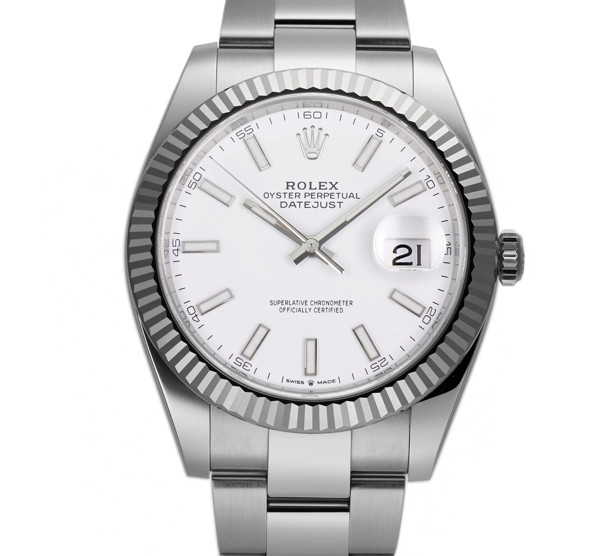 41mm Steel White Index Dial 18k White Gold Fluted Bezel Oyster Bracelet
