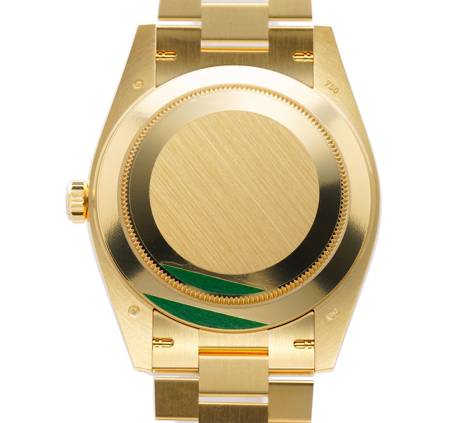 Functions are displayed on a champagne dial which is accompanied by yellow gold hands and diamond baguette hour markers. Featured on the dial is a date window as well as a day aperture.