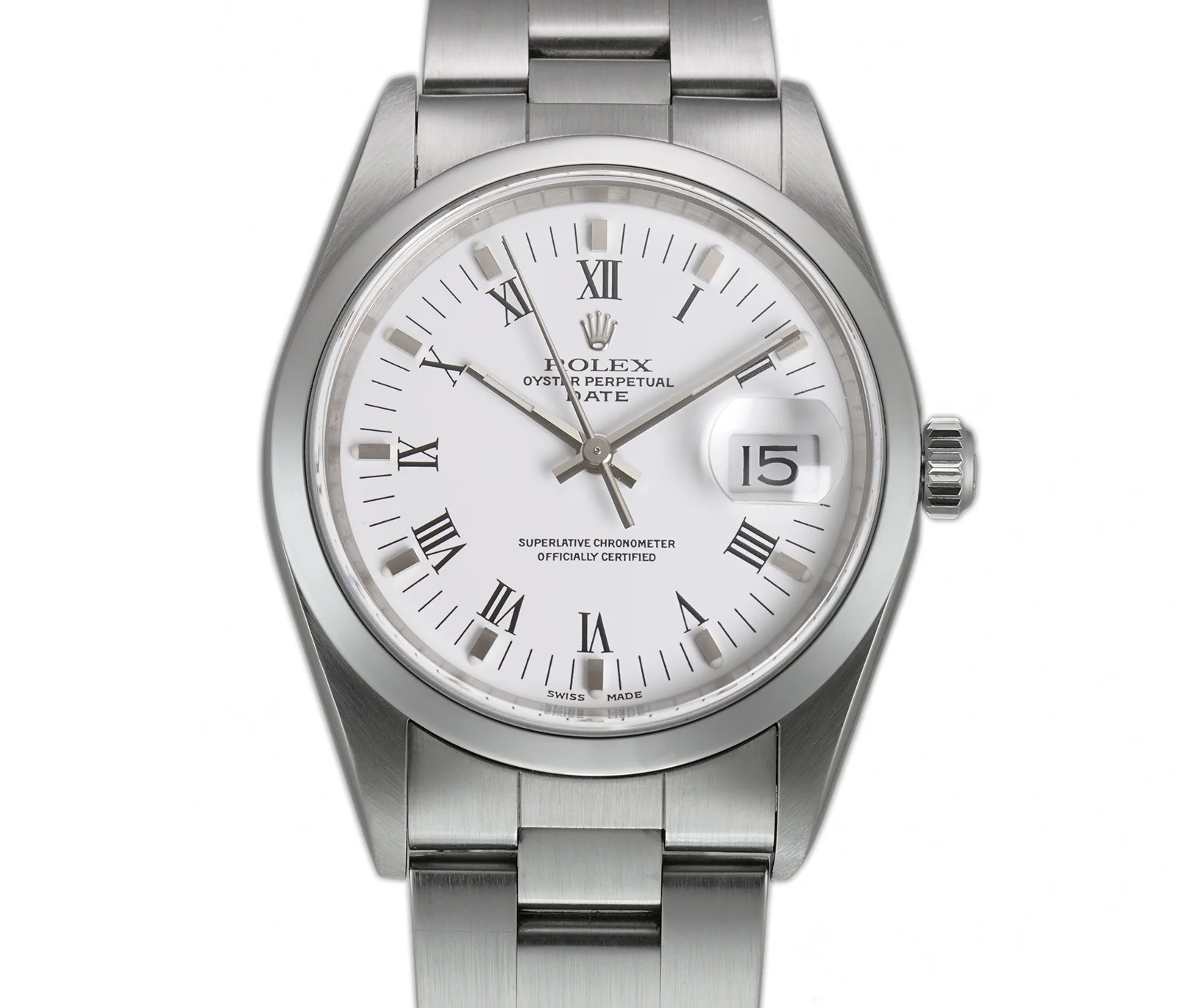 Time and date are displayed on a white dial that is accompanied by black Roman numeral hour markers.