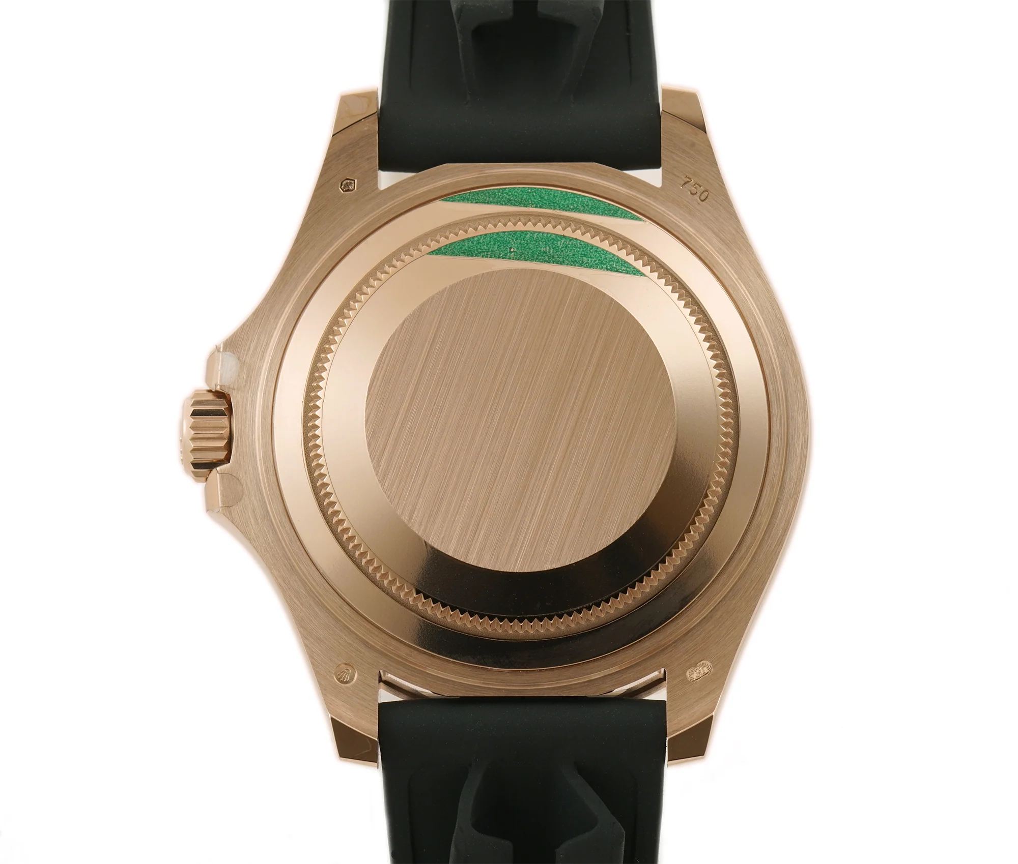 Case is made of 18k everose gold, most of which is high-polish finished with the exception of the center of the case back as well as behind the lugs. The case is equipped with a bidirectional rotatable 18k everose gold bezel that features a matte black ceramic bezel insert which is accompanied by raised 60-minute markers. Both the crown and case back are screwed down into the case. As for the band, it comes with the Oysterflex rubber strap.